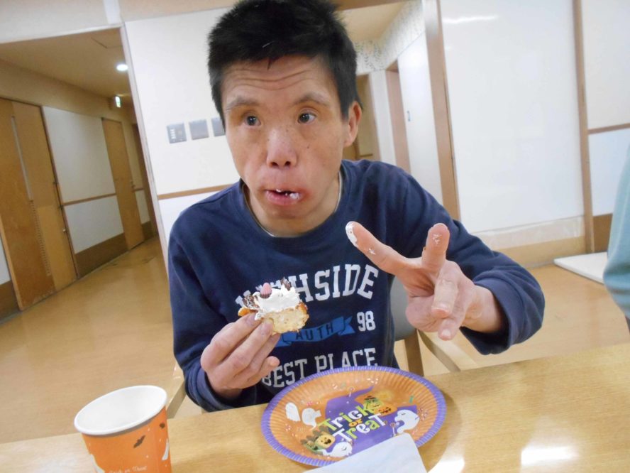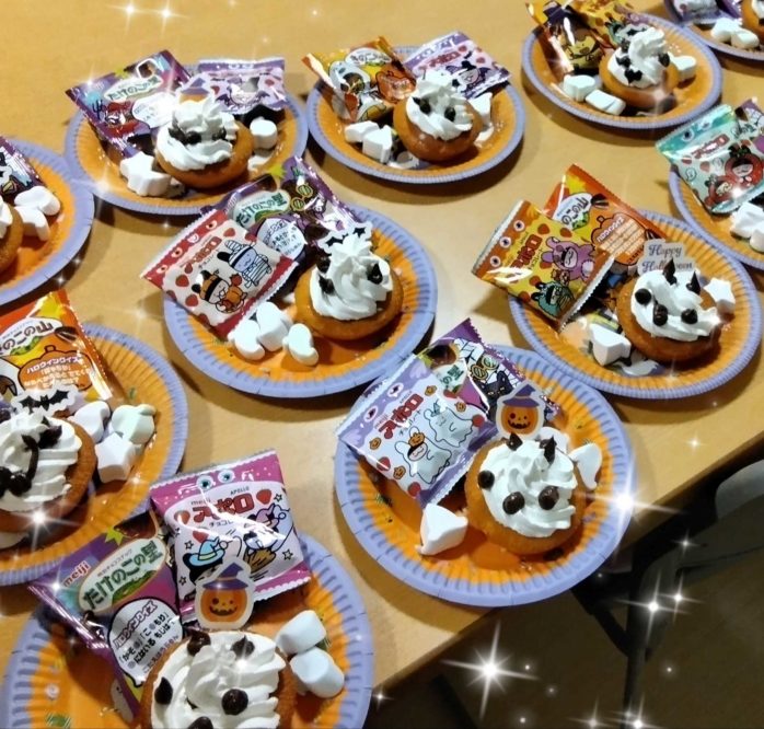 パーティでは、ケーキにお菓子をのせてデザインしました。