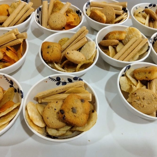 桜を見に散歩をし、帰ってきてお菓子を食べました。